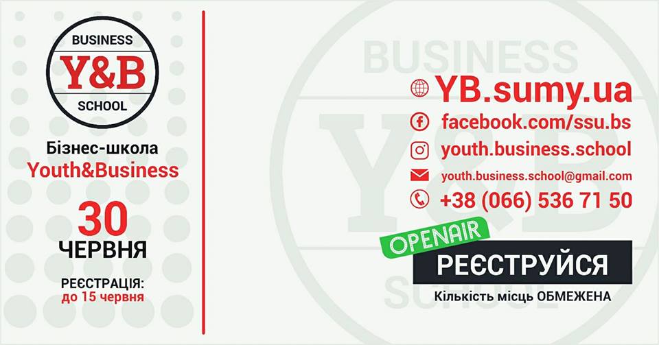 Друзі! Вже шостий раз поспіль в нашому місті Суми проводиться Бізнес-школа Сумського державного університету “Youth&Business”. Цього разу Бізнес-школа пройде 30 червня (субота) у літньому форматі OPENAIR — це один день мотивуючих виступів від спікерів-підприємців, які поділяться з тобою власними «історіями успіху», а також безцінними знаннями та досвідом зі створення та управління бізнесом.