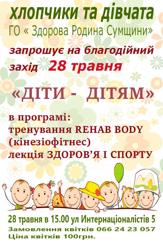 ОГ “Здорова Родина Сумщини” запрошує хлопчиків і дівчаток на благодійний захід ДІТИ – ДІТЯМ 28 травня в 15.00 вул. Інтернаціоналістів 5.