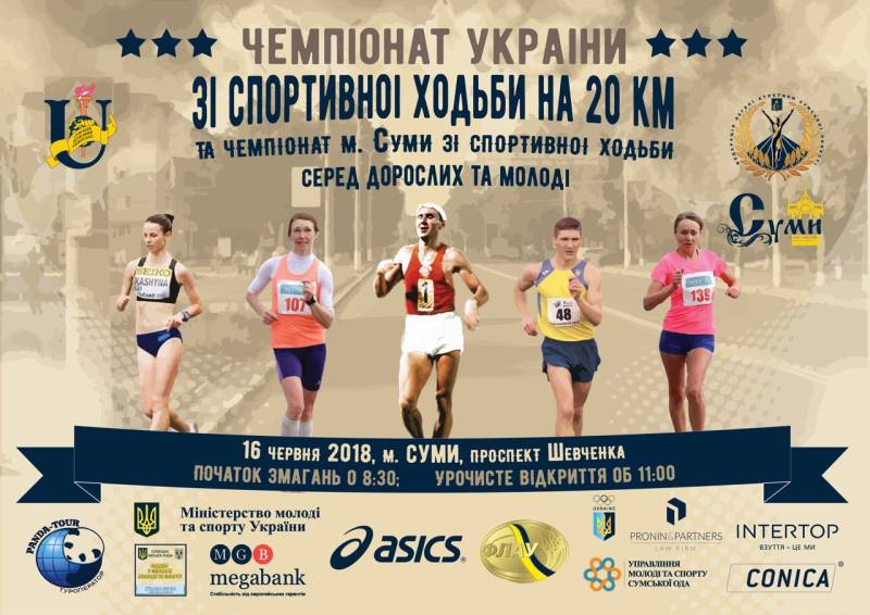 Чеміпонат України зі спортивної ходьби 08:30 Змагання Дати проведення: 16.06 Чемпіонат України зі спортивної ходьби на 20 км і Відкритий чемпіонат м Суми зі спортивної ходьби відбудуться 16 червня. Традиційно вже змагання пройдуть на пр. Шевченка. Початок о 8.30. Урочисте відкриття о 11.30. Поділитися в соціальних мережах