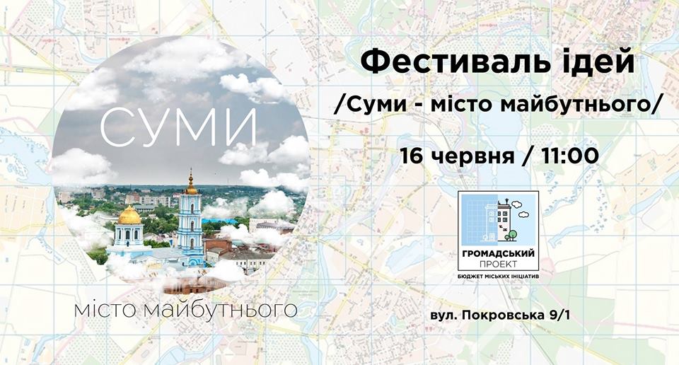 16-го червня на вул. Покровська 9/1 відбудеться Фестиваль ідей «Суми Майбутнього», – міський фестиваль, спрямований на інноваційний розвиток міста, використання нових досягнень науки і техніки, інформаційних технологій тощо.