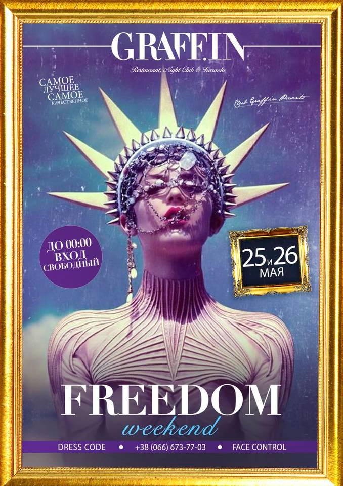Graff.in| Restaurant, Night Club & Karaoke – Freedom weekend 22:00 Нічний клуб Дати проведення: 25.05, 26.05 Be free, discover these nights for yourself!💃🏼🕺 ВХОД ДО 00:00 СВОБОДНЫЙ! Ул. Лермонтова, 17 Телефон: 066 673 7703 Поділитися в соціальних мережах
