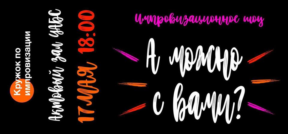 Приймайте участь в імпровізаційному шоу «А можна з вами?» Несподіваний гумор та нестандартні сценічні рішення будуть відтворюватися в режимі «тут і зараз» у відповідь на складні та хитромудрі завдання від ведучого та залу. Не пропустіть цю подію. Концерт буде проходити 17-го травня, в 18-00 в актовій залі ННІ БТ «УАБС» Сумського державного університету (вул. Петропавлівська). В програмі приймають участь актори кружка із імпровізації та соціального театру «Арт-стимул».