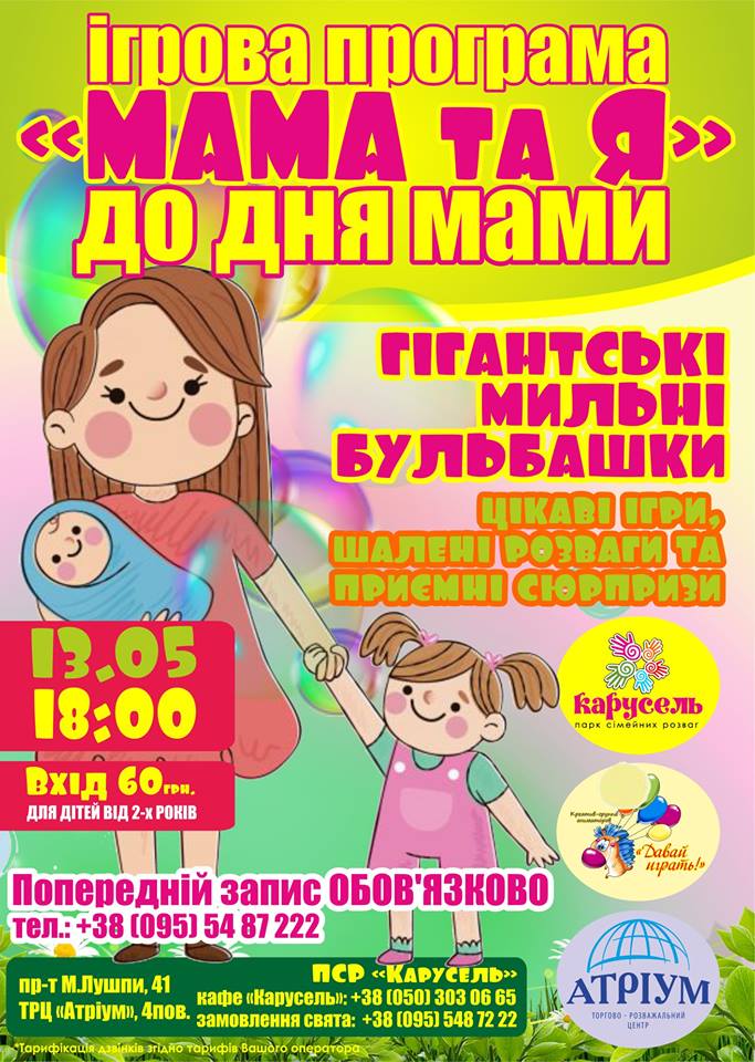 У неділю, 13 травня у ПСР “Карусель” в ТРЦ Атріум відбудеться інтерактивна ігрова програма до Дня матері «Мама+я»+гігантські мильні бульбашки.