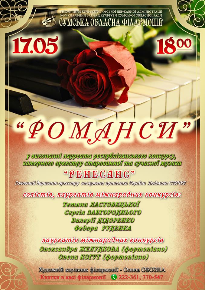 Романси 18:00 Філармонія Дати проведення: 17.05 Подія триватиме до: 20:00 Сумська обласна філармонія вул. Петропавлівська, 63 Тел. 0542 222 361 Поділитися в соціальних мережах