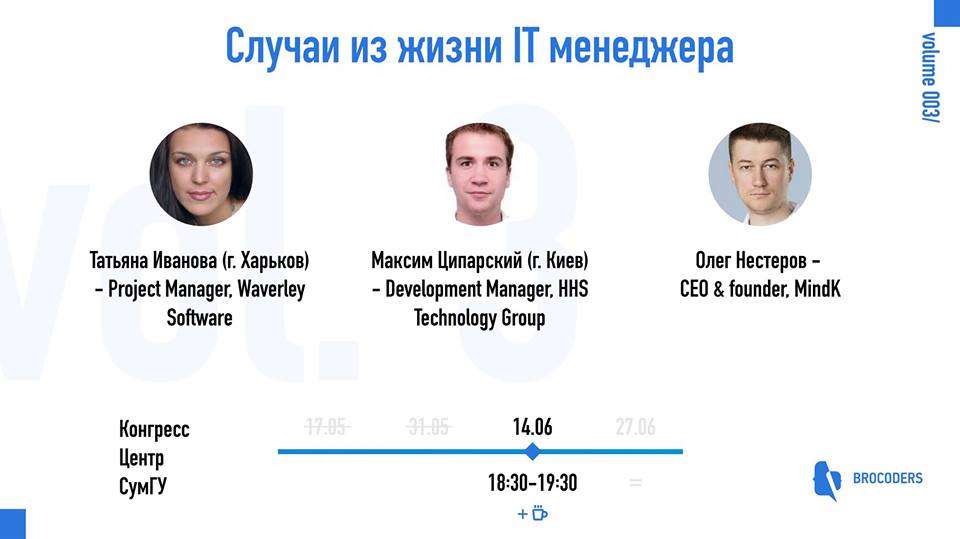 “Случаи из жизни IT менеджера” Vol.3 – это третья встреча самых крутых проектных менеджеров Сум, Киева и Харькова, где они делятся своим опытом ведения проектов. Только практические кейсы и актуальные темы!