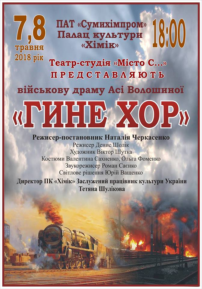 Військова драма “ГИНЕ ХОР” 18:00 Театр Дати проведення: 08.05, 09.05 Театр “Місто С..” презентує … Військова драма Асі Волошиної “Гине Хор”! Палац культури “Хімік” вулиця Миру, 28 Поділитися в соціальних мережах