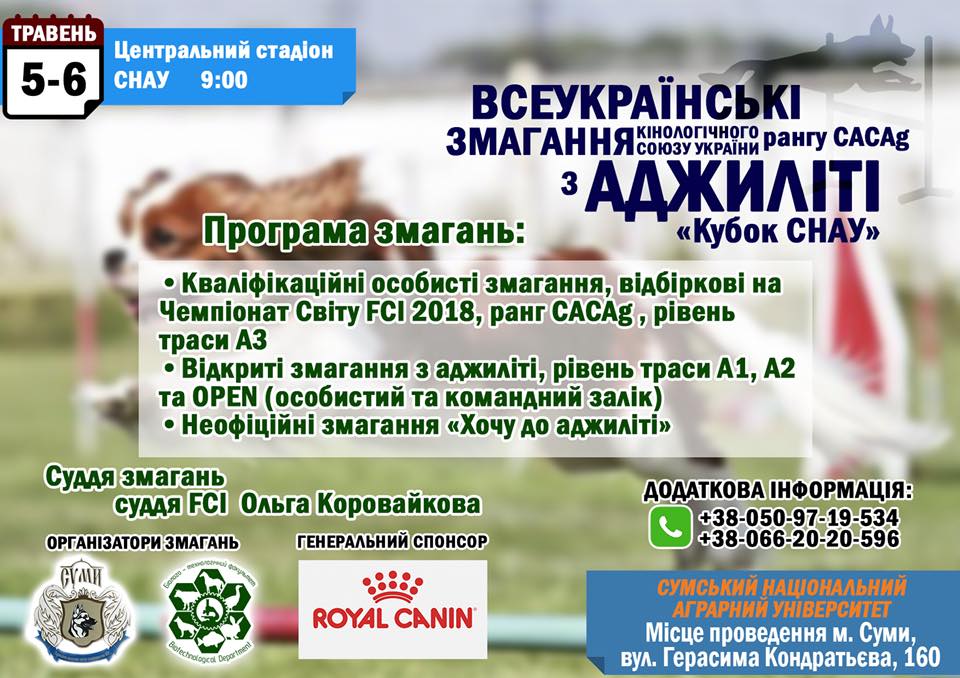 Всеукраїнські змагання кінологічного союзу України рангу CACAg з аджиліті “Кубок СНАУ” 09:00 інше Змагання Дати проведення: 05.05, 06.05 Центральний стадіон СНАУ вулиця Герасима Кондратьєва, 160 Тел.: 0509719534 0662020596 Поділитися в соціальних мережах