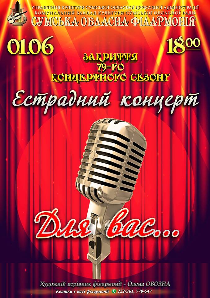 Закриття 76-го концертного сезону 18:00 Філармонія Дати проведення: 01.06 Подія триватиме до: 20:00 Естрадний концерт “Для вас” Сумська обласна філармонія вул. Петропавлівська, 63 Тел. 0542 222 361 Поділитися в соціальних мережах