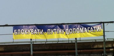 Невідомі розмістили в центрі Конотопа плакат із написом «Блокувати — Путіну допомагати!» на залізничному переїзді біля Європейського університету. Відповідне фото