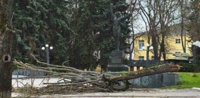 У центрі Глухова через шквальний вітер повалило дерево. Негода наробила клопоту просто в середмісті. Інформація про можливі наслідки та пошкодження