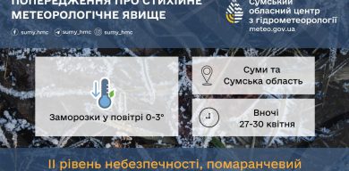 Вночі 27 – 30 квітня по Сумській області та м.Суми очікуються заморозки у повітрі 0°..-3°. За повідомленням обласного гідрометцентру, це