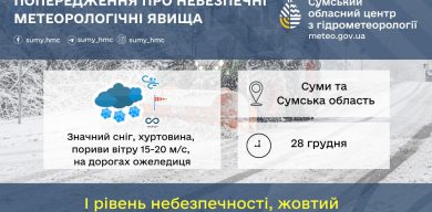 Вночі 28 грудня по Сумській області та місту Суми очікується значний сніг, мокрий сніг, налипання мокрого снігу, протягом доби пориви