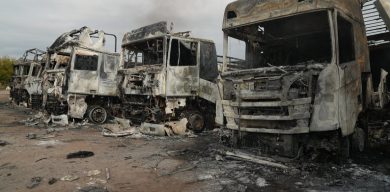 Згоріли сім приватних вантажівок у Сумах внаслідок нічного удару безпілотниками по одній з автостоянок міста, що поряд із центром перетримки безпритульних тварин.