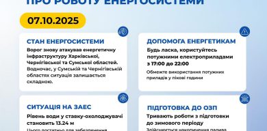 Про ситуацію в енергосистемі на 7 жовтня повідомляє Міністерство енергетики України. Ворог знову атакував енергетичну інфраструктуру Харківської, Чернігівської та Сумської областей.