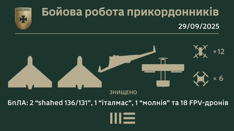 Минулої доби прикордонники ліквідували на Сумщині 22 ворожих безпілотники. Серед них: 2 ударні дрони-камікадзе «шахед», 1 «італмас» та 1 «молнія».