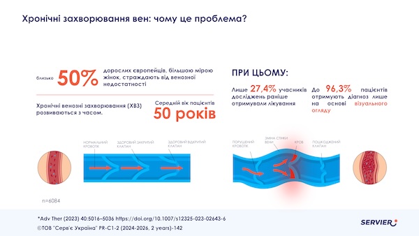 Як наголосили учасники конференції, хронічні венозні захворювання (ХВЗ) є однією з найбільш поширених проблем сучасної медицини. За останніми міжнародними дослідженнями, від 52% до 70% дорослого населення різних країн страждають від проявів венозної недостатності2. В Україні цей показник також є значним, особливо серед людей середнього та старшого віку.