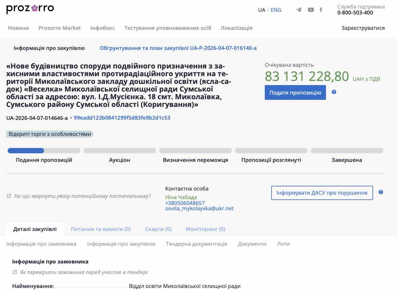 Вражаюча сума, серйозні плани та життя фактично на лінії вогню! У селищі Миколаївка Сумського району збираються витратити понад 83 мільйони гривень на безпеку найменших мешканців. Відповідний тендер із чималим бюджетом уже «світиться» на платформі державних закупівель Prozorro.