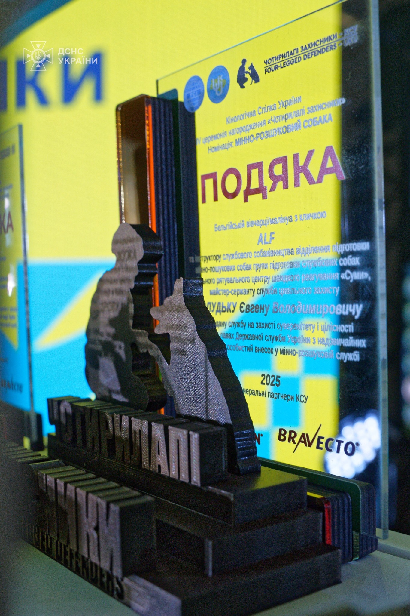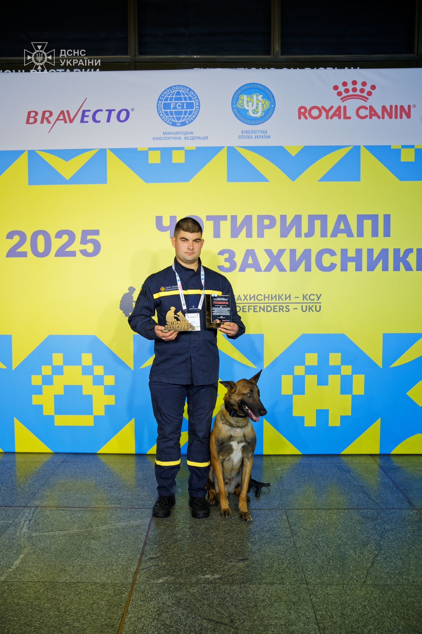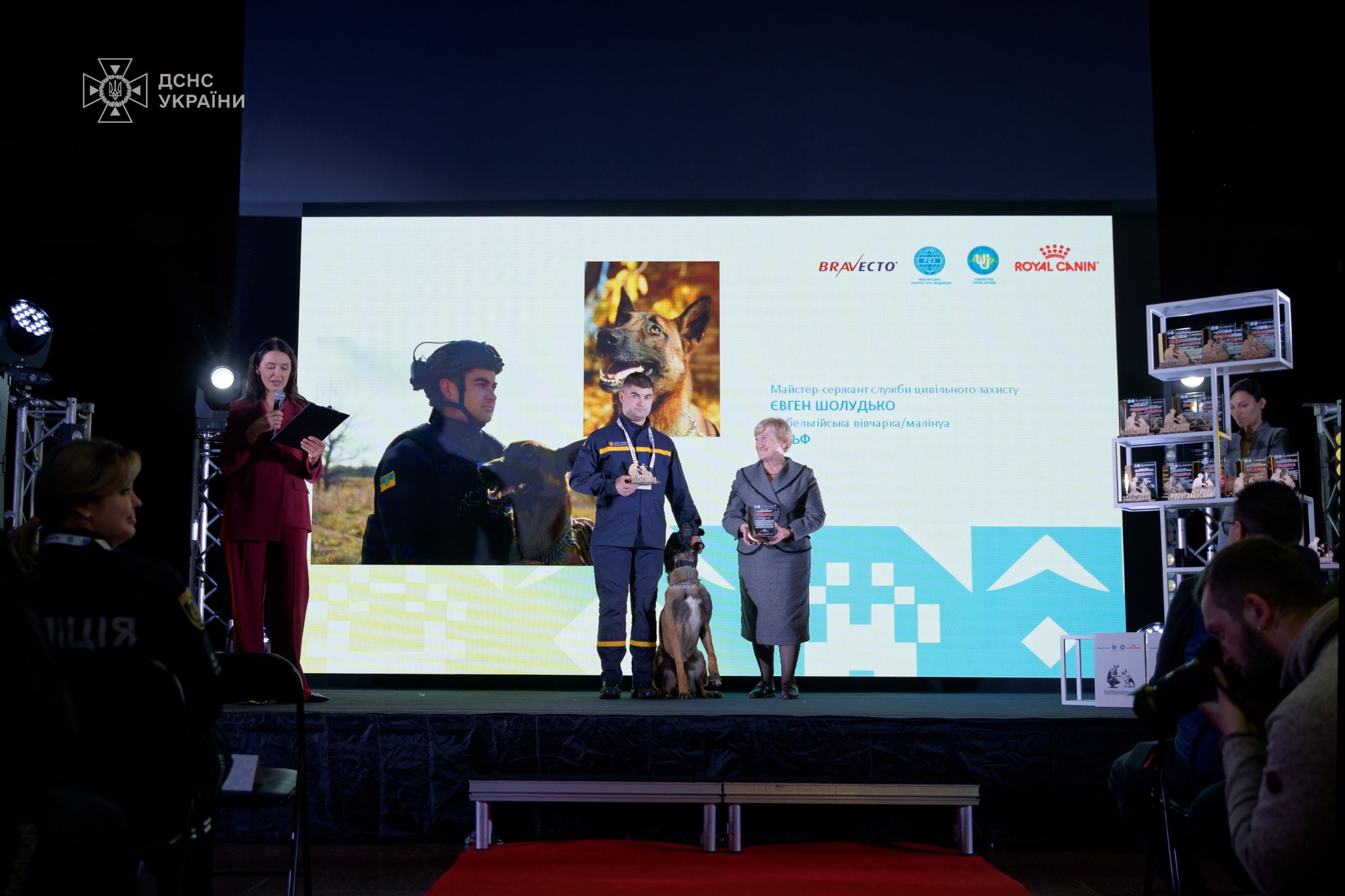 Номінація «Мінно-розшукові собаки»: Євген Шолудько з Мобільного рятувального центру швидкого реагування «Суми» ДСНС та бельгійська вівчарка малінуа Alf. Їхня щоденна праця є критично важливою для розмінування територій та забезпечення безпеки населення.