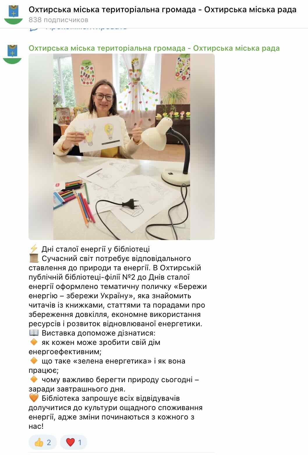 В Охтирській бібліотеці-філії №2 вирішили “зробити внесок” у сучасність і відкрили тематичну поличку про енергоефективність. Так, саме поличку. З книжками й порадами, які, здається, ще пам’ятають радянські лампочки та слова “збережи електроенергію — вимкни праску!”