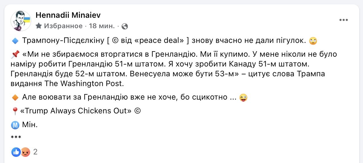Колишній очільник Сум, який тепер веде запеклі дивані бої переважно на полях Фейсбуку, вибухнув «експертним» аналізом щодо планів Дональда Трампа купити Гренландію. Пан Мінаєв, не добираючи слів і не переймаючись дипломатичним етикетом, обізвав американського лідера «Трампоном-Пісдєлкіним» та поставив йому діагноз на відстані — мовляв, тому «вчасно не дали пігулок».