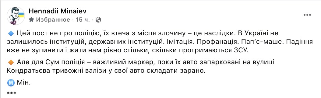 «Цей пост не про поліцію, їх втеча з місця злочину – це наслідки. В Україні не залишилось інституцій, державних інституцій. Імітація. Профанація. Пап’є-маше. Падіння вже не зупинити і жити нам рівно стільки, скільки протримаються ЗСУ».
