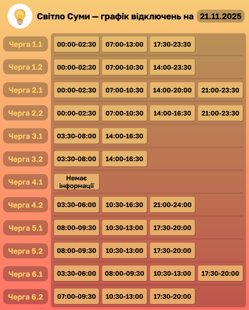 Сумщина продовжує жити в режимі енергетичної непередбачуваності. На 21 листопада Національна енергокомпанія знову змінила графіки погодинних відключень.