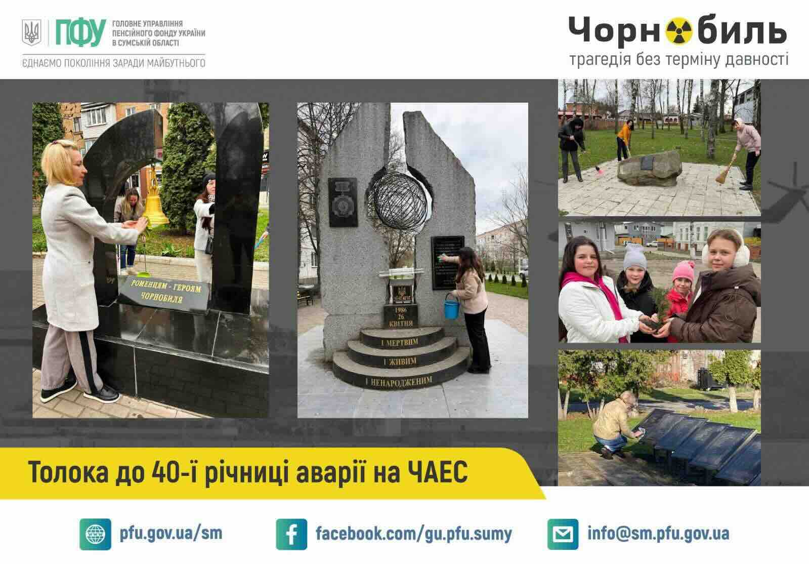 «Напередодні 40-ї річниці аварії на ЧАЕС працівники Головного управління Пенсійного фонду України в Сумській області долучилися до заходів із благоустрою на Сумщині. Фахівці Пенсійного фонду Сумщини прибрали меморіали та території навколо них, присвячені трагедії Чорнобильської катастрофи та її ліквідаторам».