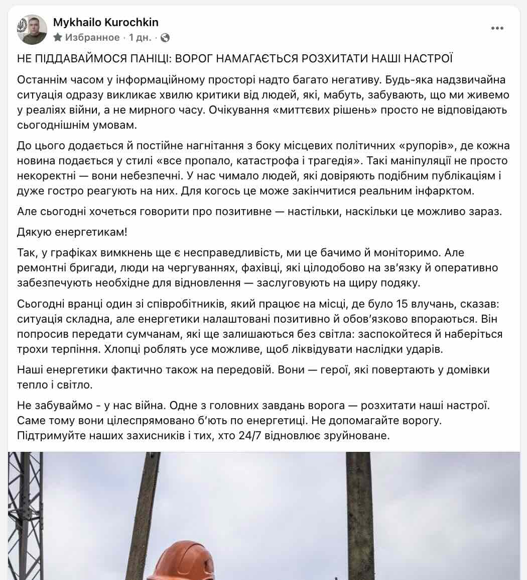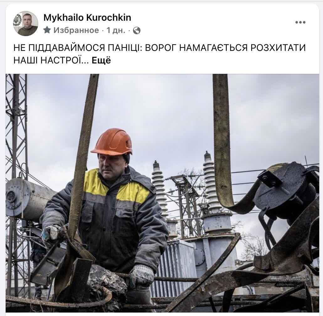 Допис пана Курочкіна з’явився у Фейсбуці саме тоді, коли на місці трагедії було скупчення техніки та людей. Наступного ранку після атаки, коли рятувальники та електрики намагалися реанімувати мережу, активіст вирішив, що це ідеальний момент для «позитивного» посту, для чого він безпосередньо прибув на обʼєкт влучання.
