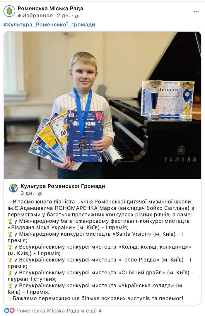 У Ромнах — справжнє культурне диво. Або ж ярмарок марнославства небачених масштабів. Міська рада та відділ культури з помпою прозвітували про «тріумф» юного піаніста Марка Пономаренка, який примудрився «перемогти» аж у шести конкурсах одночасно. Моцарт нервово палить осторонь, а Горовиць перевертається в труні.