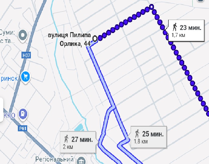 Час у дорозі для бабусі з паличкою — 40 хвилин в один бік.