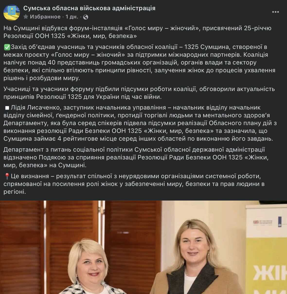 Організатори гордо розповіли, що коаліція «1325 Сумщина» об’єднує понад 40 представниць НГО, влади і структур безпеки. Звучить як сила. Але от питання: хто саме від цього став у безпеці?