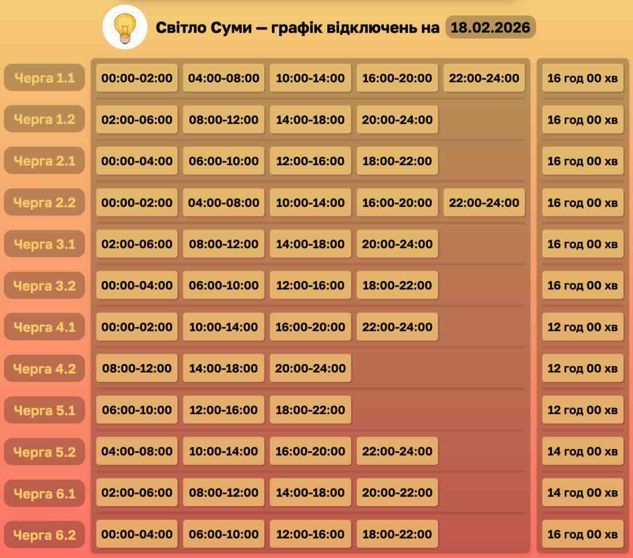 Для мешканців Сумської області опублікували графік відключень електроенергії на 18 лютого 2026 року.