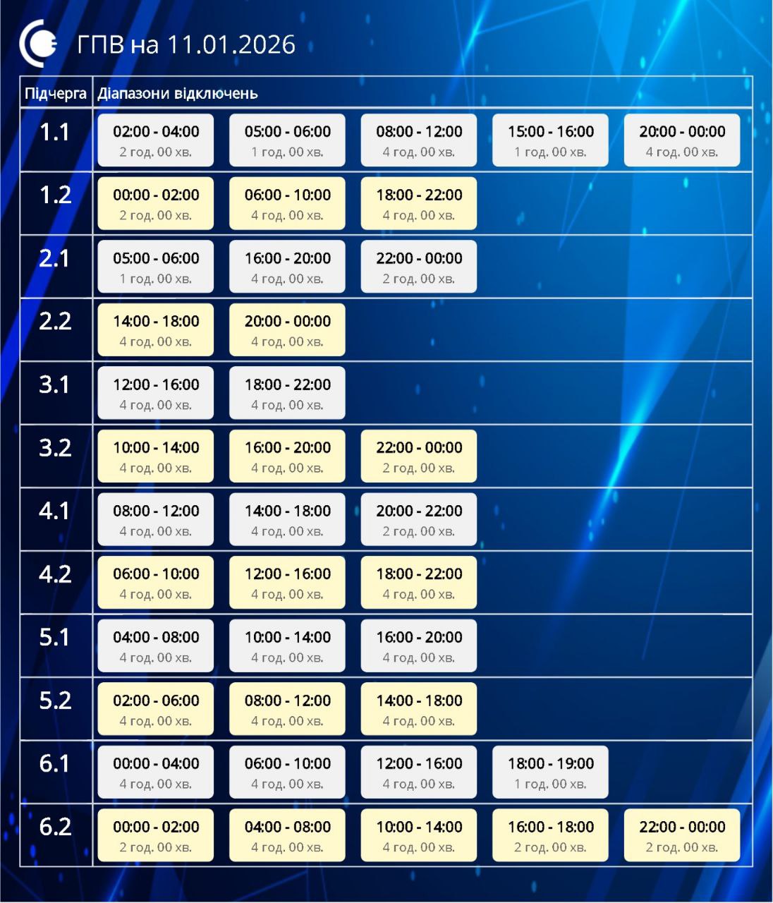 Графік відключень на 11 січня