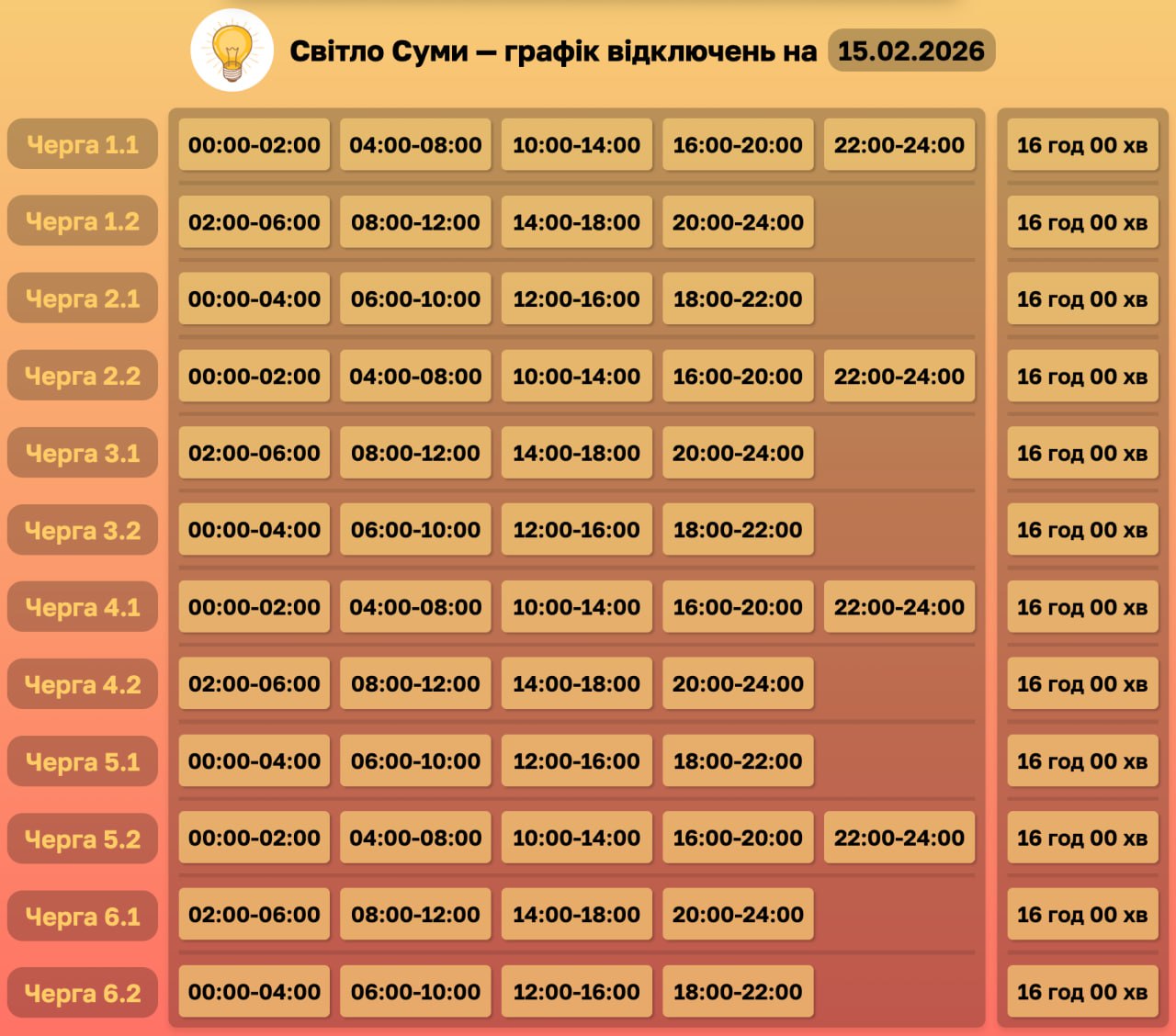 Завтра, 15 лютого, діятимуть графіки погодинних відключень відповідно до обсягів, доведених командою з НЕК “Укренерго”.