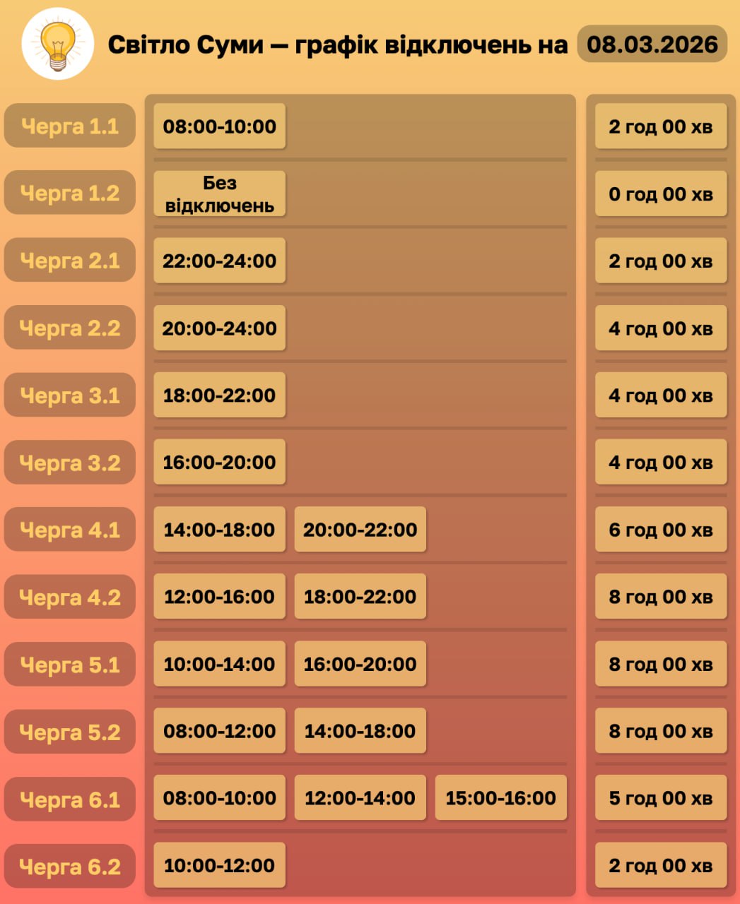 Завтра, 8 березня, діятимуть графіки погодинних відключень відповідно до обсягів, доведених командою з НЕК “Укренерго”.