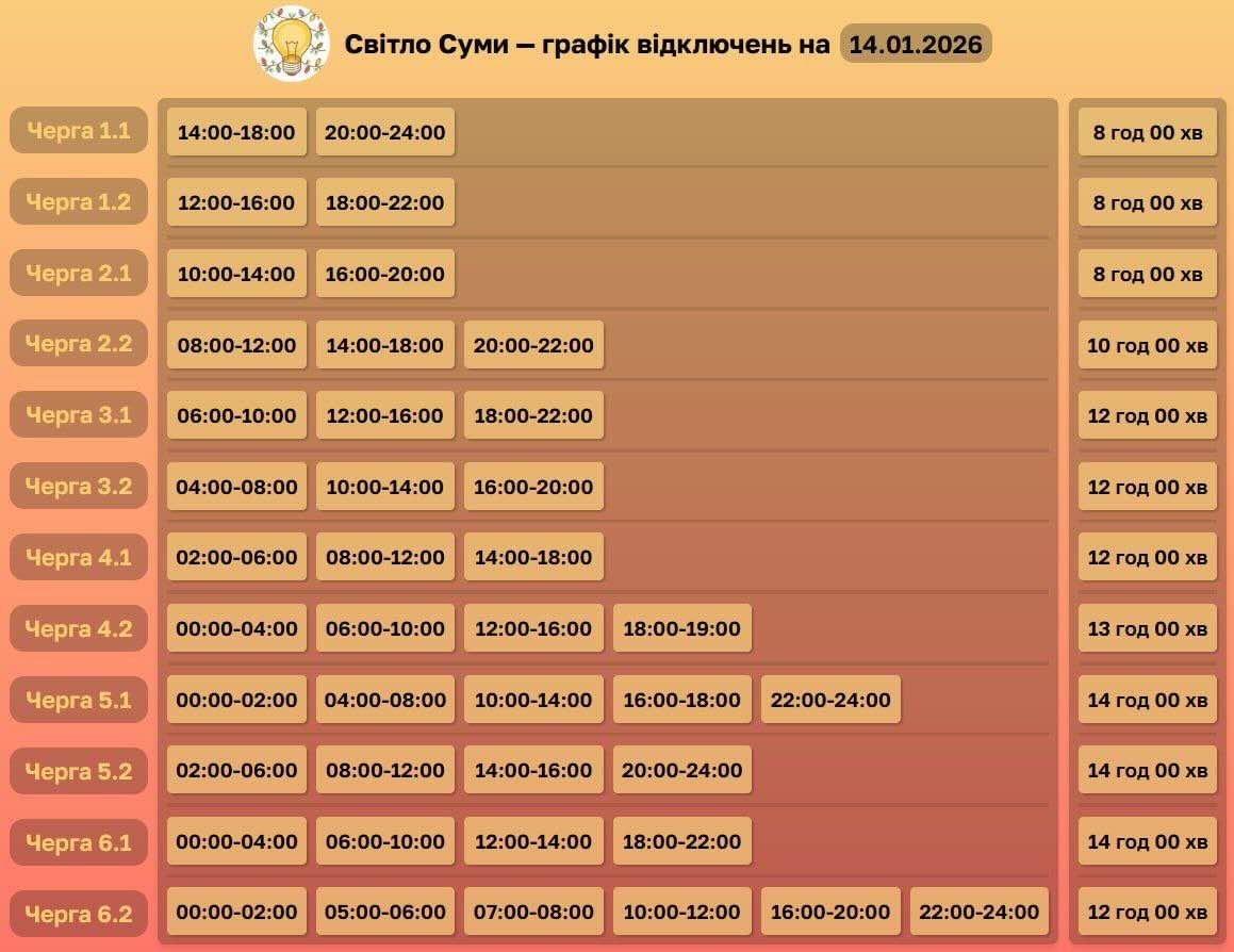Завтра, 14 січня, мешканців Сумщини знову випробовуватимуть на міцність. НЕК «Укренерго» спустила нові ліміти, і цифри в графіках не тішать: за офіційним планом без електрики доведеться сидіти від 8 до 14 годин.