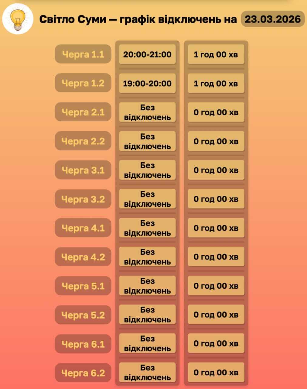 Мешканців закликають уважно стежити за оновленнями, адже час і тривалість відключень можуть змінюватися протягом дня.