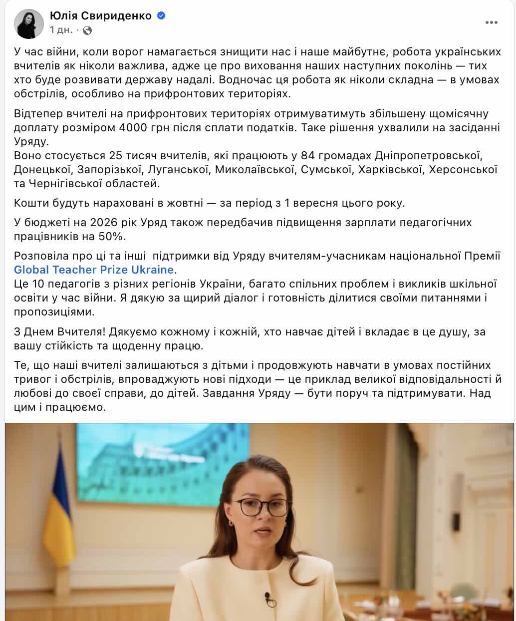 Найяскравішим підтвердженням ефективності спільних дій стало недавнє рішення уряду. Вчителі, які працюють на прифронтових територіях, тепер отримуватимуть щомісячну доплату в розмірі 4000 гривень. Про це заявила прем’єр-міністр Юлія Свириденко. За її словами, це рішення торкнеться близько 25 тисяч педагогів у 84 містах та громадах Сумської, Донецької, Дніпропетровської, Запорізької, Луганської, Миколаївської, Харківської, Херсонської та Чернігівської областей. Виплати стартують вже цього місяця, разом із зарплатою за вересень.