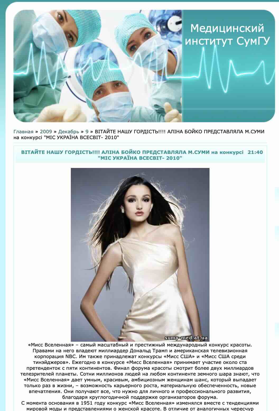 Ще у 2009 році аматорський сайт Сумського медичного інституту (https://sumy-med.at.ua/) писав: “ВІТАЙТЕ НАШУ ГОРДІСТЬ!!!! АЛІНА БОЙКО ПРЕДСТАВЛЯЛА М. СУМИ…” — раділи успіхам студентки на конкурсі “Міс Україна Всесвіт”. Тоді ж наївним сумським дівчатам розписували перспективи: кар’єрний ріст, матеріальна забезпеченість, подорожі світом, шанс, що випадає раз у житті…