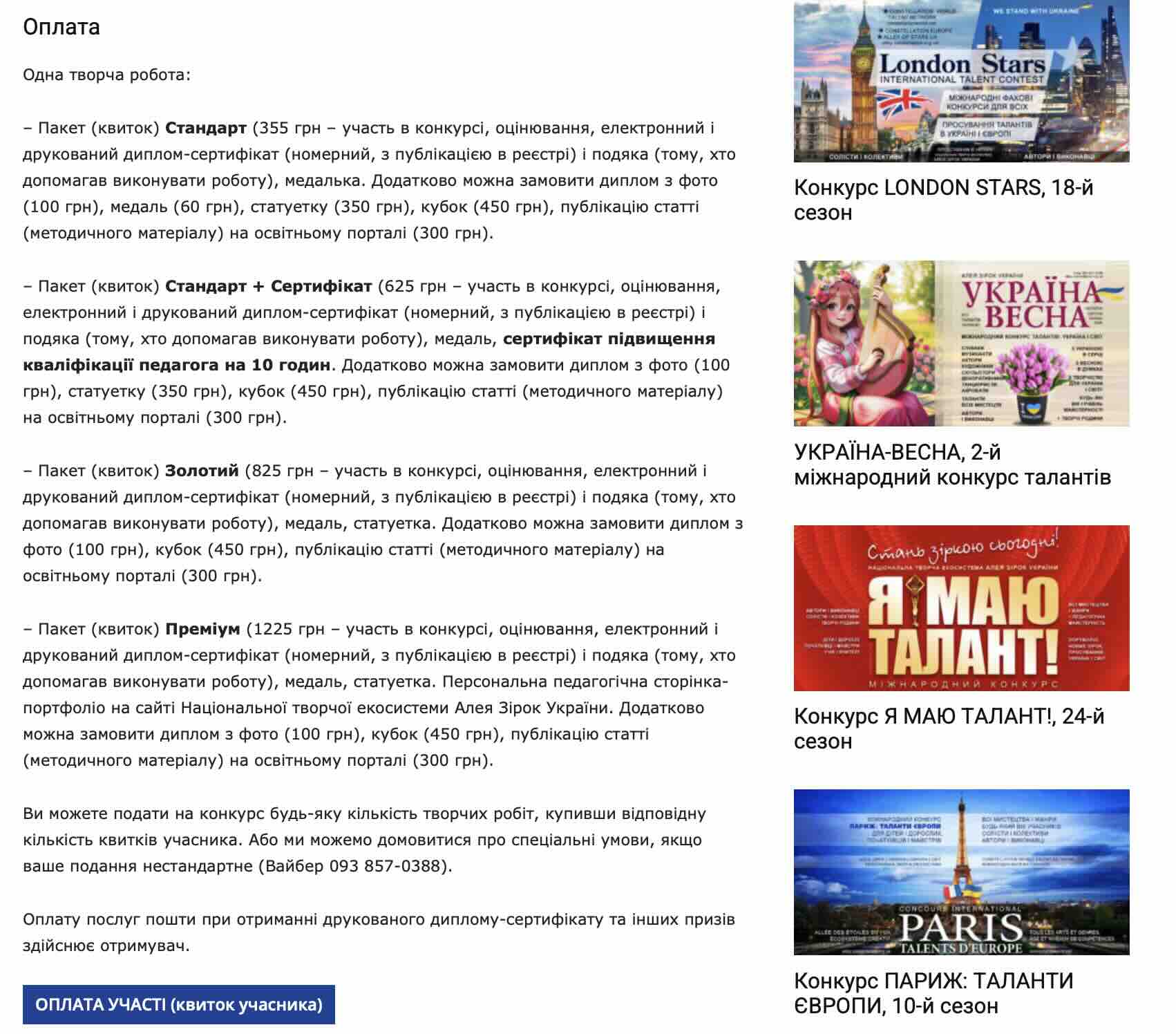 За 355 гривень можна отримати “Стандартний” диплом, за 625 — ще й “підвищення кваліфікації на 10 годин”, за 825 — медальку й статуетку, а за 1225 — навіть “персональну сторінку на Алеї зірок України”. І все це — дистанційно, без експертизи, без жодного відношення до Міністерства освіти.