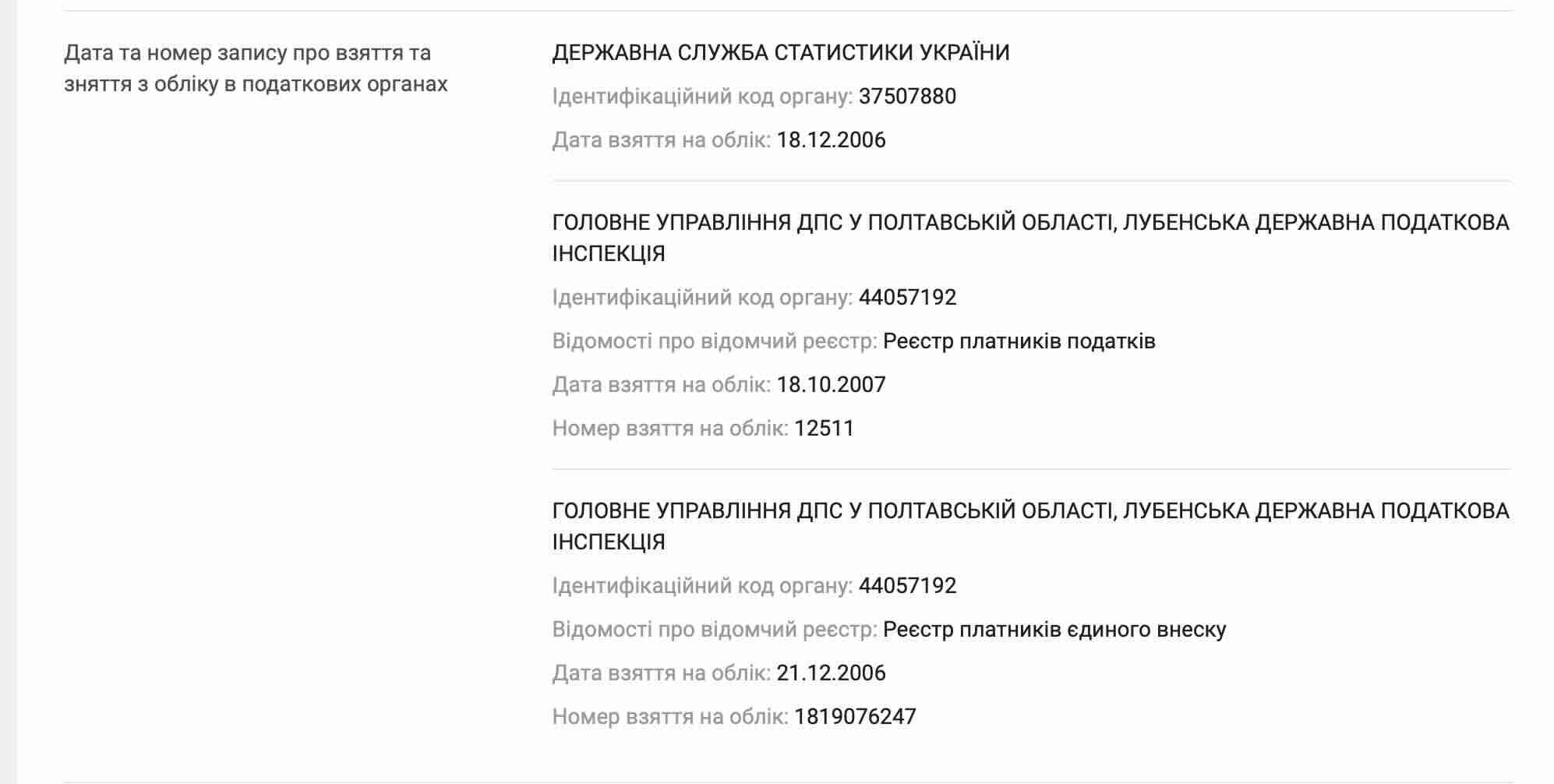 У реєстраційних даних чорним по білому написано: податковий облік — Головне управління ДПС у Полтавській області, Лубенська державна податкова інспекція. Причому помилки тут взагалі не може бути, адже видно, що у 2025 році навіть змінилася адреса через перейменування вулиці Чкалова на вулицю Захисників України. Тобто починаючи із 2006 року це підприємство вправно платило податки, але не до сумського бюджету, а в Полтавську область.