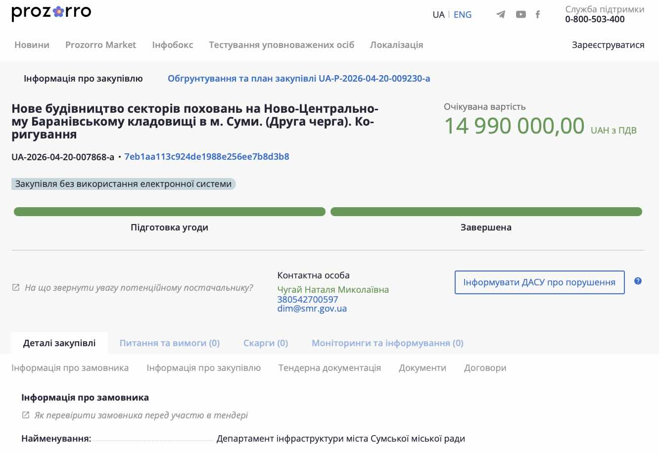 Закупівлю провів Департамент інфраструктури Сумської міської ради без використання електронної системи торгів. Підставою стала норма урядової постанови, що дозволяє такі процедури під час воєнного стану.
