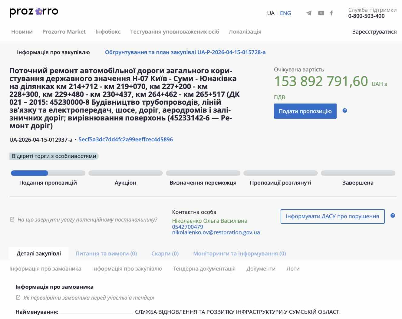 Подати тендерні пропозиції можна до 23 квітня, а аукціон запланований на 24 квітня. Завершити ремонтні роботи планують до 30 листопада 2027 року.