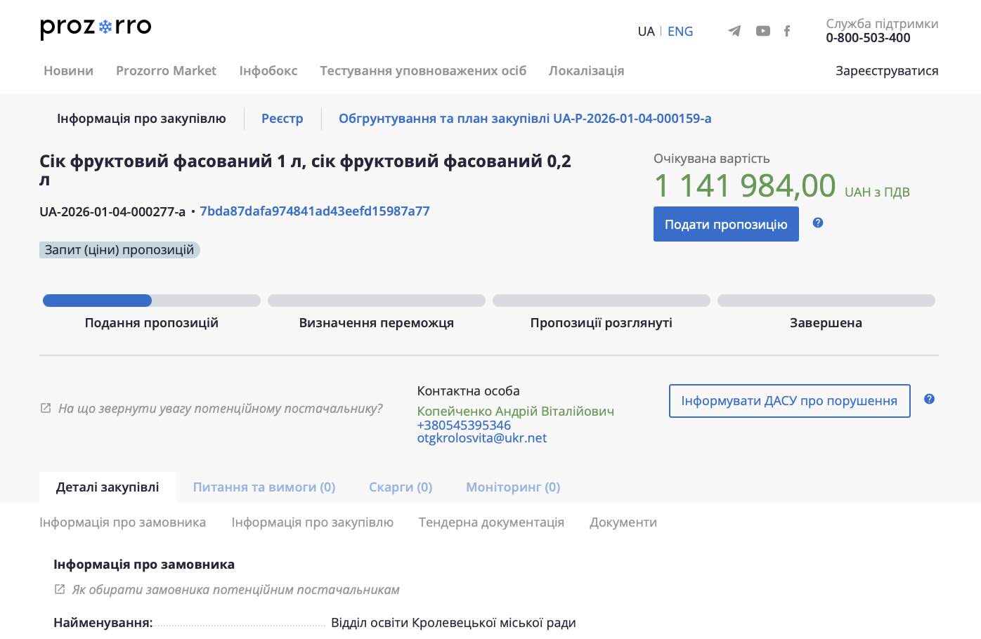 Поки батьки збирають кошти на потреби класів, а громада економить кожну гривню на ЗСУ, Відділ освіти Кролевецької міської ради вирішив влаштувати справжній «бенкет»… на папері? Чиновники планують витратити понад 1,1 мільйона гривень на фруктові соки. Ми проаналізували цю закупівлю і знайшли в ній цифри, які викликають підозру не лише у завищенні цін, а й у відсутності елементарної логіки.