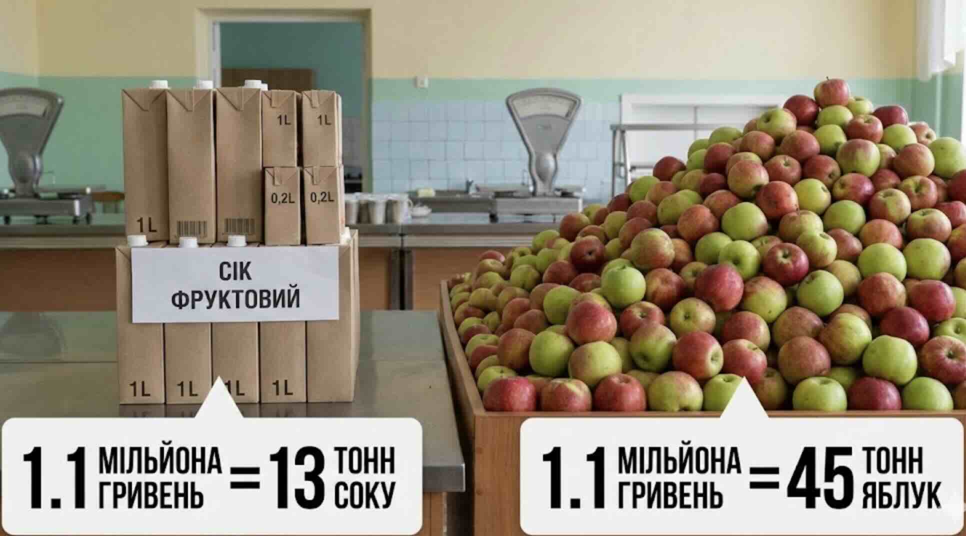 Ми порахували: якби 1 141 984 гривні витратили не на сік, а на свіжі фрукти, за ці кошти можна було б придбати від 28 до 45 тонн яблук! Це майже втричі більше, ніж об’єм замовленого напою.