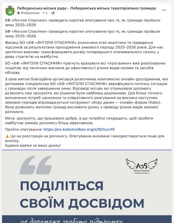 Лебединська міська рада, схоже, знайшла собі нове покликання, вирішивши попрацювати безкоштовною піар-агенцією. На своїх офіційних ресурсах чиновники завзято публікують інформацію від благодійного фонду «Янголи Спасіння», який проводить опитування про те, як громади пережили зиму 2025–2026 років.