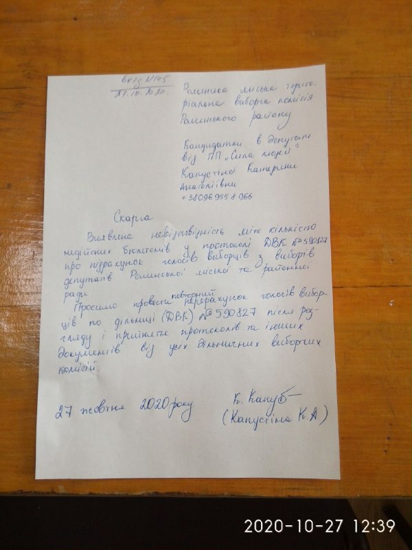 Зокрема, кандидатка у депутати Роменської міської ради від партії «Сила людей» Катерина Капустіна стверджує, що у протоколі виявлено невідповідність між кількістю недійсних бюлетенів.