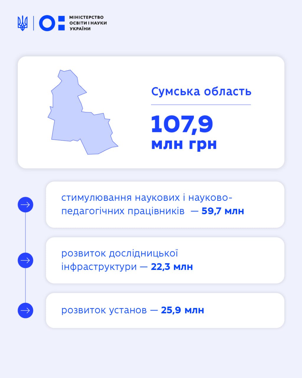 Сумська область отримає 107,9 млн грн. У регіоні працюють університети та наукові установи, які розвивають дослідження у різних галузях науки.