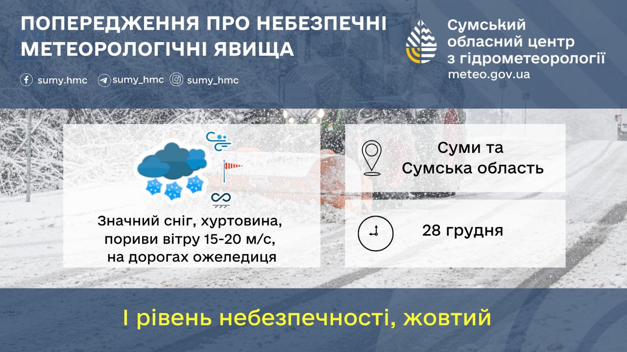 Вночі 28 грудня по Сумській області та місту Суми очікується значний сніг, мокрий сніг, налипання мокрого снігу, протягом доби пориви північно-західного вітру 15-20 м/с, хуртовина, на дорогах ожеледиця (І рівень небезпечності, жовтий). Про небезпечні метеорологічні явища повідомляє Сумський обласний центр з гідрометеорології.
