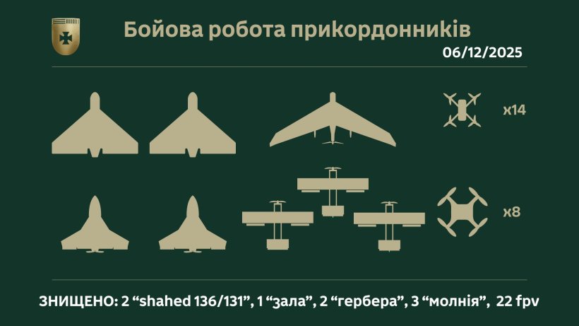 Зокрема, бійці 5 прикордонного загону ліквідували 1 «шахед», 2 «гербери», 1 «зала», 3 «молнії» та 22 FPV-дронів, з яких 8 були керованими за допомогою оптоволокна.